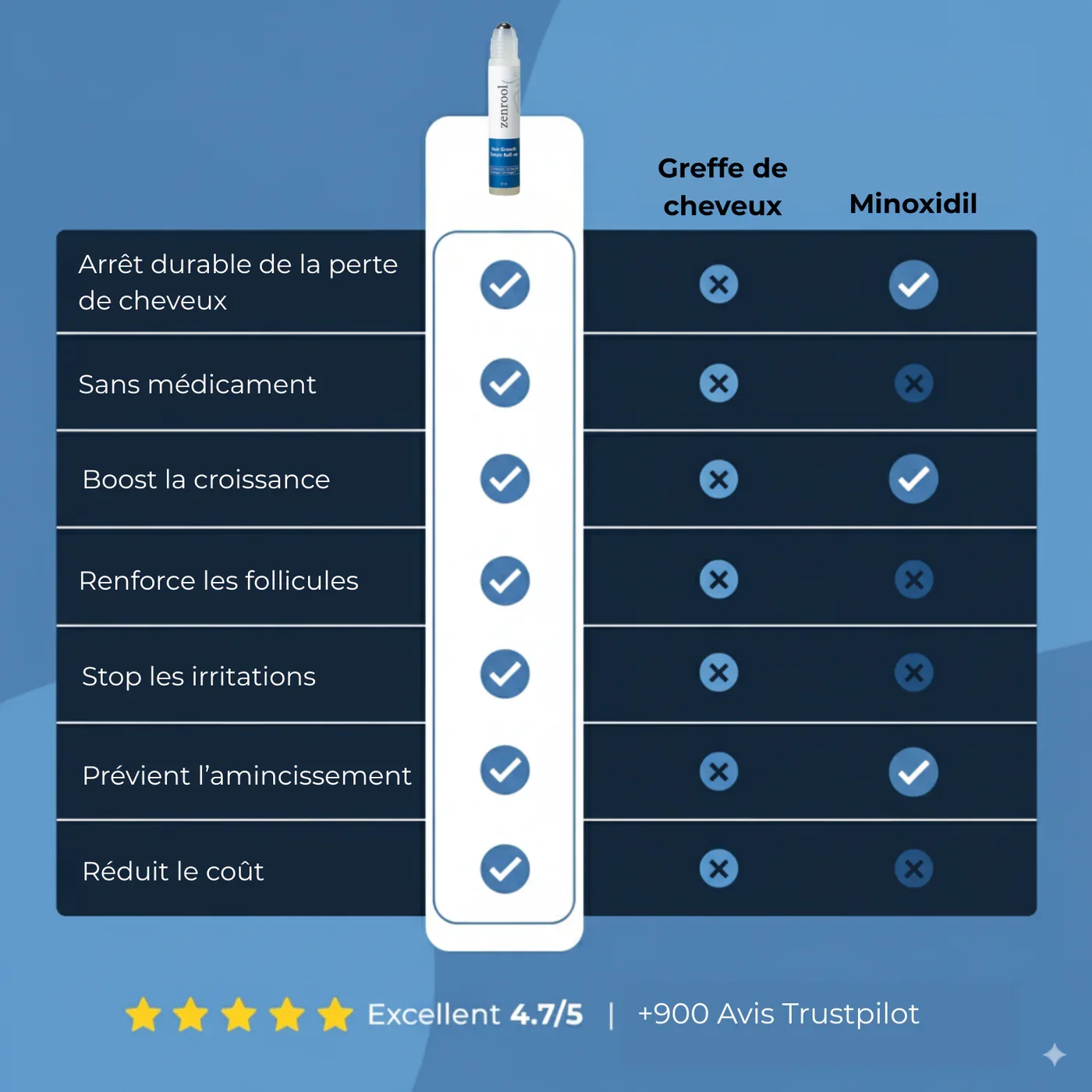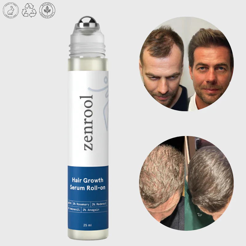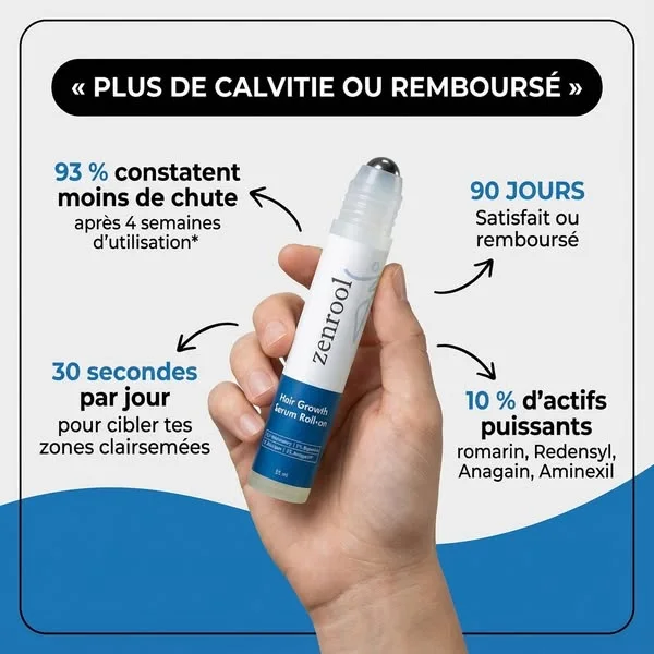 👉 Zenrool agit directement à la racine : il réveille les follicules, prolonge la phase de croissance et bloque les signaux de chute.