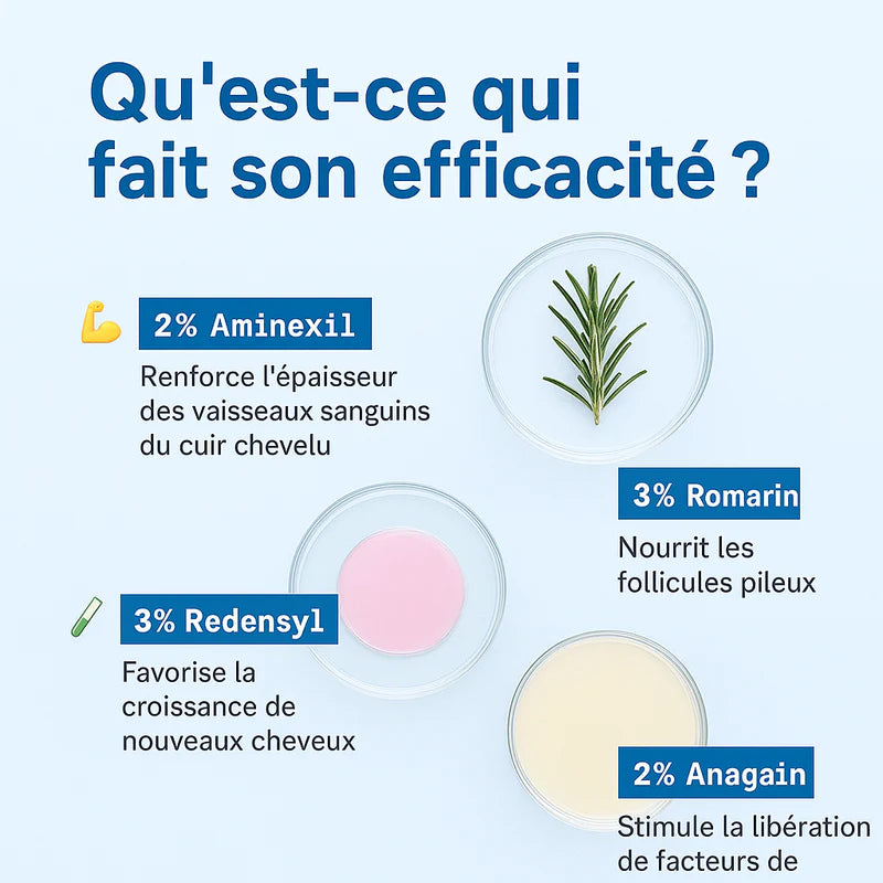 Redensyl (3%) Complexe breveté qui cible les cellules souches du follicule, favorise la régénération capillaire et stimule la repousse visible.